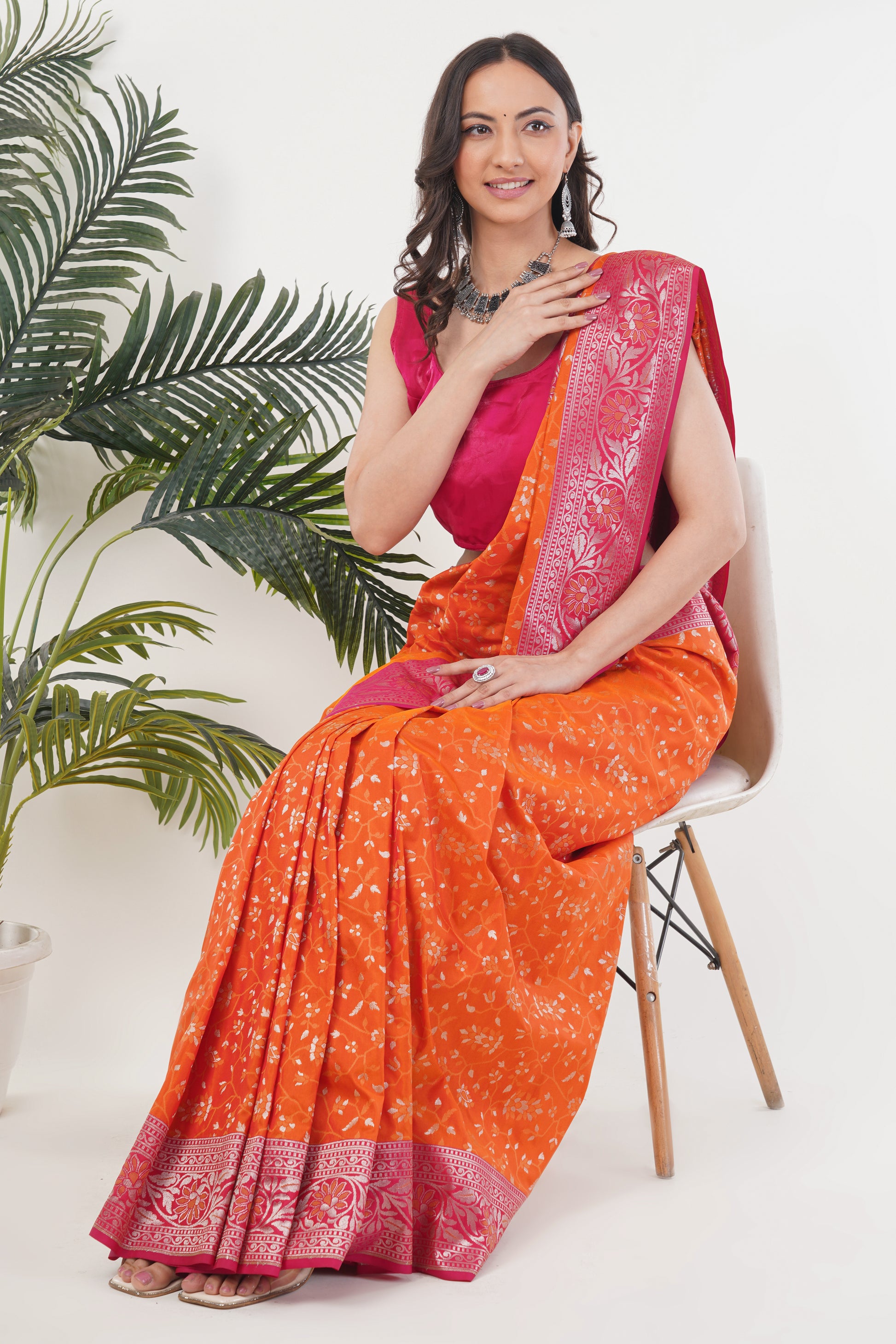 The vibrant orange body is adorned with delicately woven small floral motifs, creating a balanced and understated pattern across the fabric. A richly detailed pink border and pallu, highlighted with traditional floral vines and intricate zari work, adds contrast and definition, lending the saree a classic yet striking appeal.